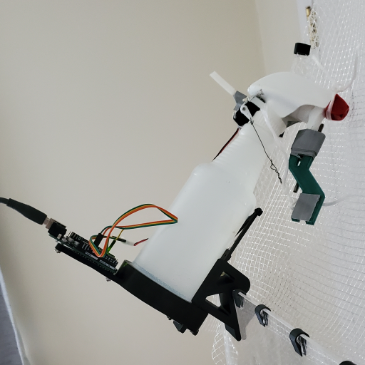 Fortunately, I had been learning Arduino recently, and I thought about using one to activate a spray bottle pointed into my geckos' cage. With less than a week left to produce and test the device, I had to work fast, using a combination of old parts from other projects and new parts. The Arduino mounted on the body of the spray bottle would turn a servo every 30 minutes. The servo was attached to the spray bottle with zip ties and pulled the trigger with a steel wire. the entire assembly would hang on the top of the gecko cage aimed downwards.