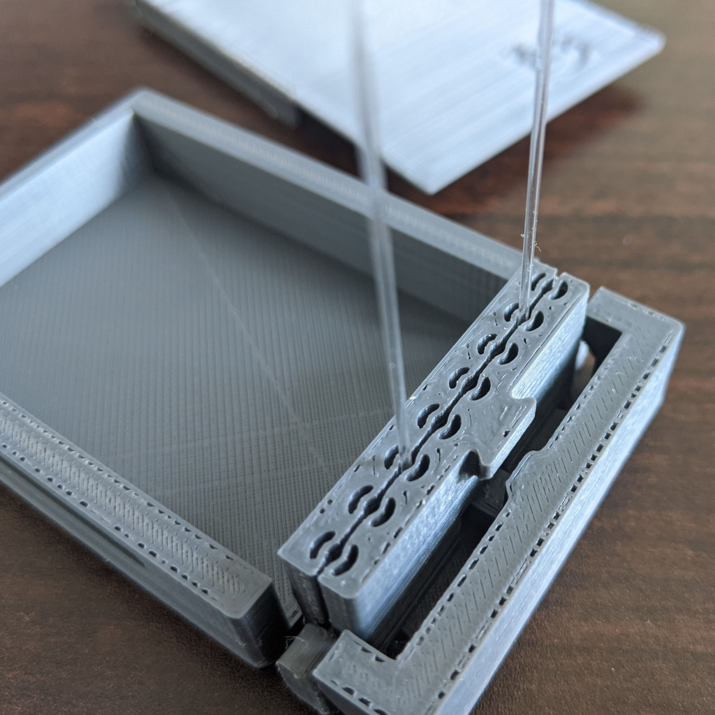 Gel cutting is a common lab practice. It is usually done by reused razor blades which carry the risk of both sample contamination and sharp object injury. To address this issue, I designed a one-time-use square tube equipped with a slider to eject the cut agar. Using my experience in making single print parts, I made the slider and tube print in a single piece with some internal stoppers to prevent the slider from falling out.