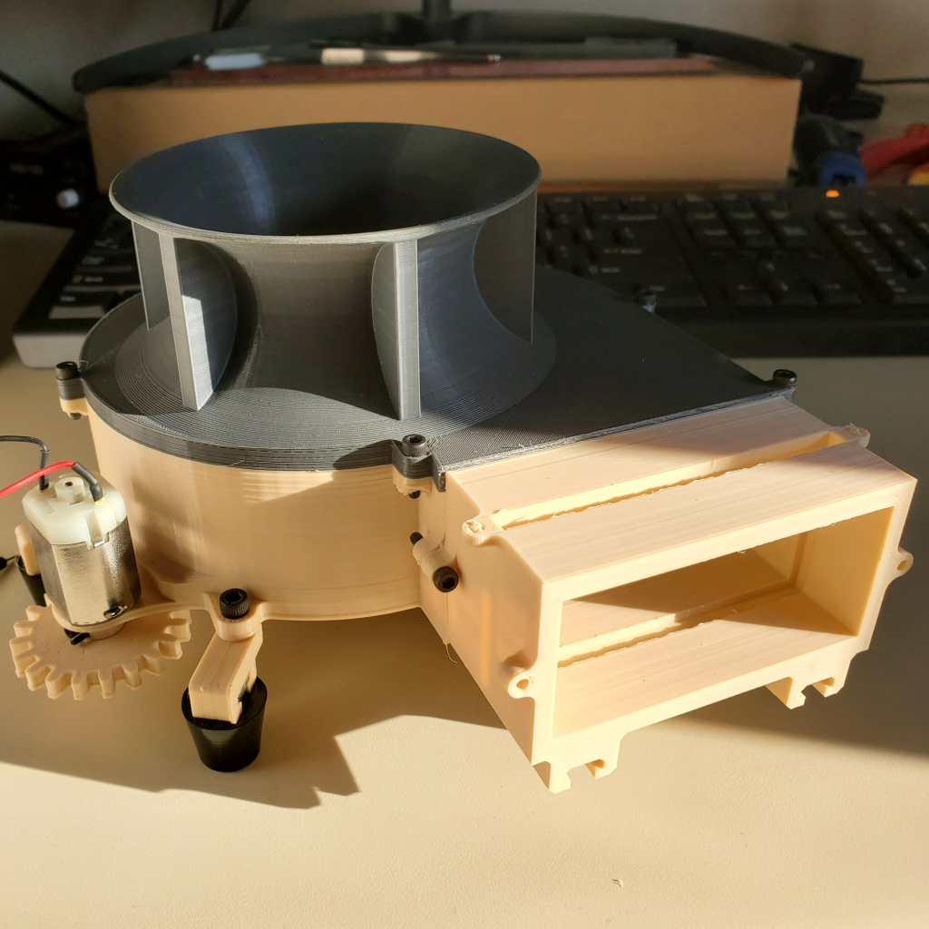 To power the fan, I used a small DC motor. It directly drove the fan for the prototypes and was changed to driving a gear chain in order to save space in the final version. The intake features a velocity stack as a part of the lid which ensures smoother airflow into the fan.