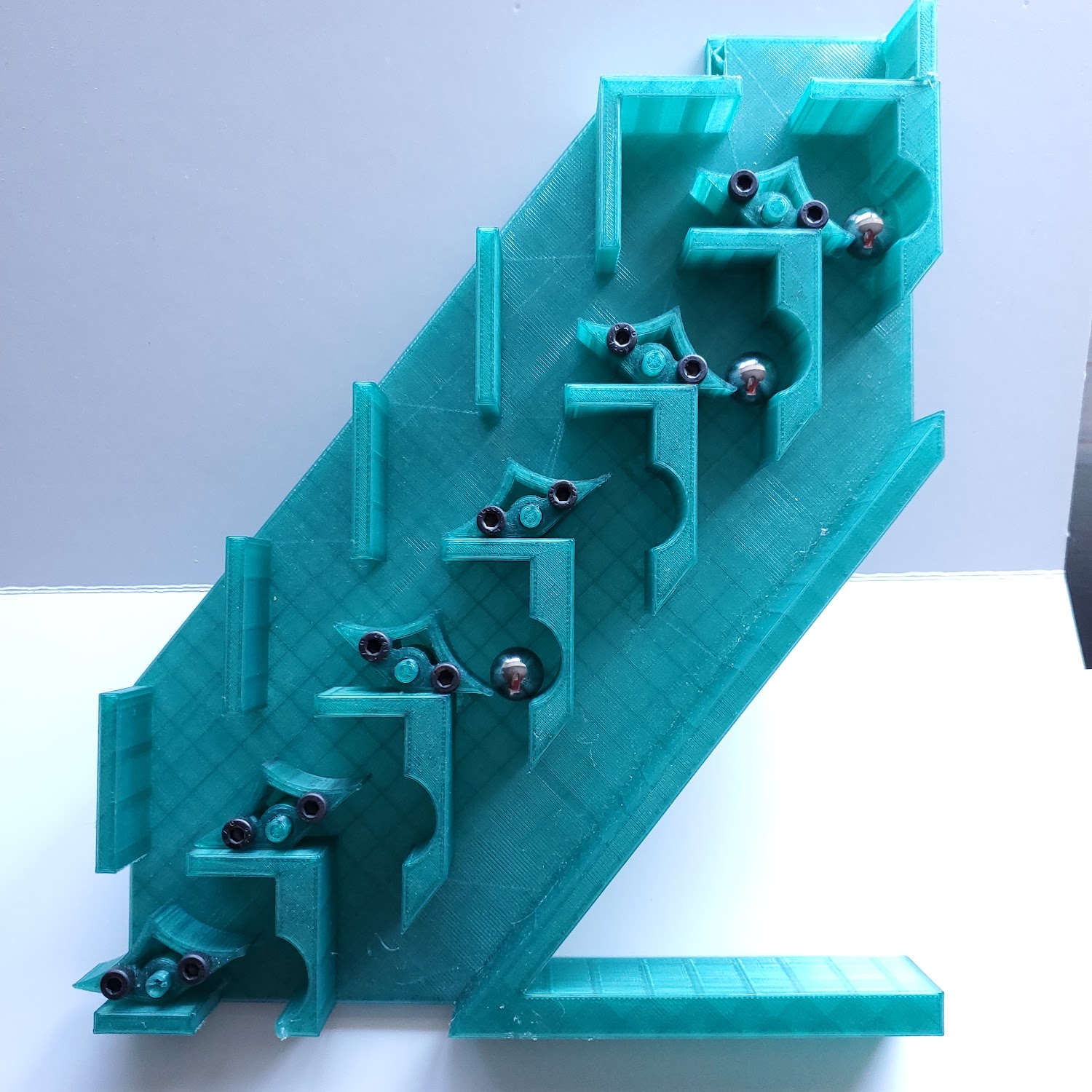 The idea was to create a marble machine utilizing recycled materials such as cardboard and toothpicks. This is the first part of the machine: a module for marble throwing.