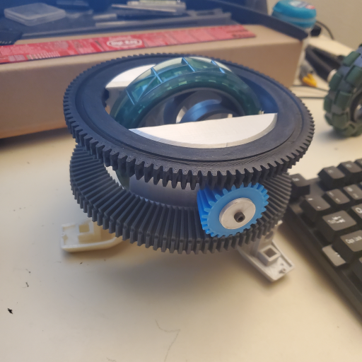 After the success, I moved on to the final design. Centered around a VEX robotics wheel, two large 3D-printed ring gears surrounded it driving a steel axle. A 3D-printed case holds the entire system together and acts as a mounting point for motors and electronics. The design is viewable alongside a upgraded version two here.