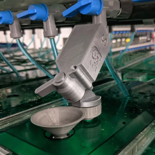 The whole apparatus is comprised of a funnel that connects to the tank, an adapter, and a single-print feeder. The funnels fit various sizes of tanks, providing a universal base for the feeder. The feeder stores food in an upper hopper, which feeds into a rotating compartment. When the lever is pushed, this compartment rotates and dispenses the food. The inlet and outlet of the rotating compartment are offset in such a way that food is only allowed to either flow in or flow out, but never at the same time. This guarantees that the amount of food dispensed per lever push is consistent.