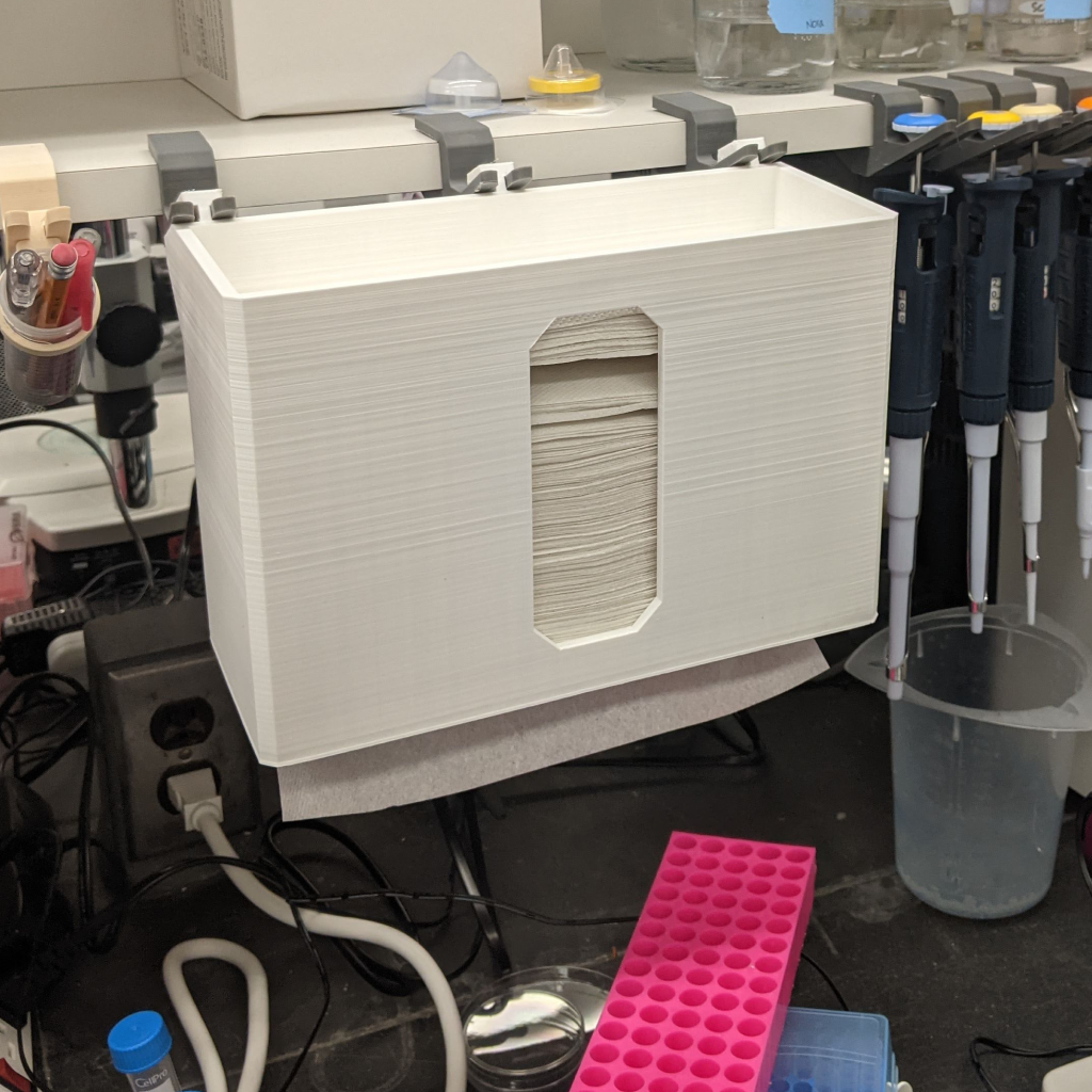 Paper towels are an absolutely required item for lab work. However, people usually have to compromise between accessibility and convenience of using it. Either it is installed on the wall away from the bench, or it is left in a messy fashion on the bench. My design provides a neat solution to cover both bases. Coupled with my Multi-purpose Holders, the dispenser can be positioned almost everywhere in the lab.